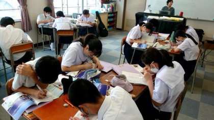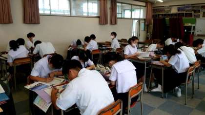 2年生音楽の授業で「サンタルチア」を歌います。今日は楽譜見ながら「調合」について学習します。楽譜の左に書いてある#や♭の記号をグループ毎にチェック中。先生が弾くピアノに合わせて調合が確認できましたか?