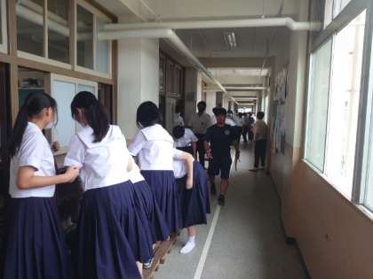 本日6時間目に地震に伴う津波発生を想定した避難訓練を行いました。非常ベルに続いて緊急の避難指示が放送されました。皆さん、次々に廊下に出てきました。