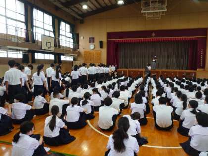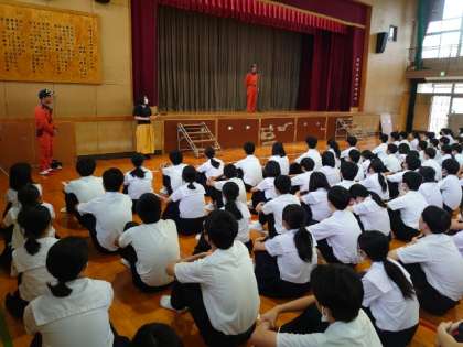 放送の指示をしっかり守り、全員の避難が完了しました。最後に天王寺消防署の方からお話をうかがいました。災害時には、日頃の心の備えの有無が被害を左右するそうです。今日の訓練を活かしてくださいね。