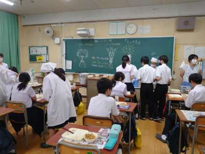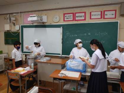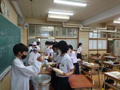 お昼休みになり、お楽しみの給食の時間。1年生の皆さんが配食準備に大忙し。今日は「麻婆春雨・モヤシの甘酢和え・黒豆」の中華メニュー。しっかりといただいて午後も頑張りましょう。