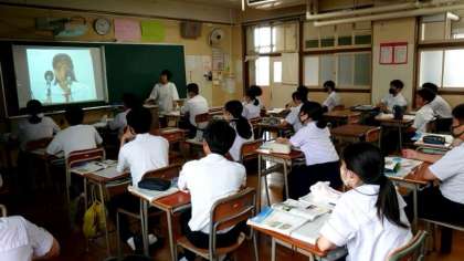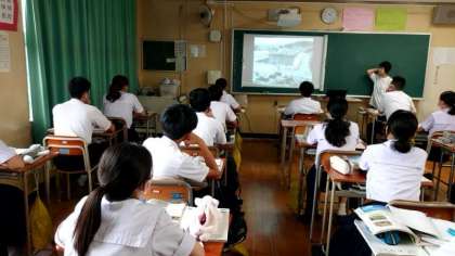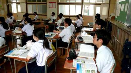 2年生社会科で沖縄の歴史についてNHKの報道資料を視聴します。第2次大戦で激戦地となった沖縄。戦後も米軍基地が置かれ、現在も日本全体の70%の米軍基地が沖縄にあるとのこと。現状と課題について、映像を視ながら考えましょう。