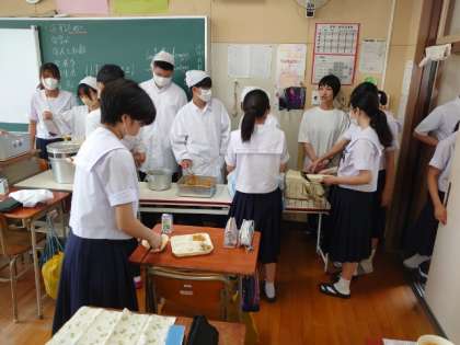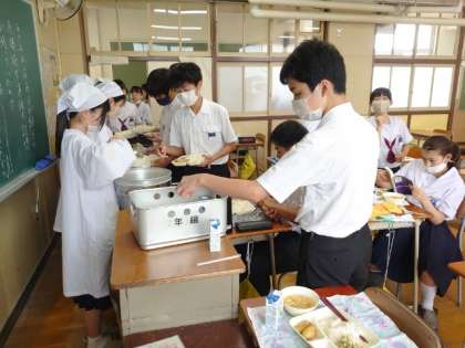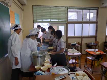 お昼休みになり、楽しみな給食の時間です。2年生の教室では皆さん配食の列を作っています。今日の献立は「白身魚のフリッター・すまし汁・鶏と菜っ葉の炒め物」。鶏と菜っ葉の炒め物はご飯に乗っけていただきましょう。