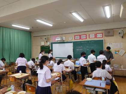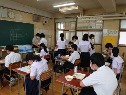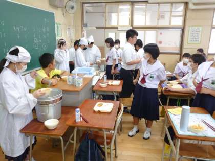 1年生の教室でも給食の準備中。白身魚のフリッターはメレンゲのフワフワした衣が美味しそう。もし余分があれば、お代わりしてくださいね。