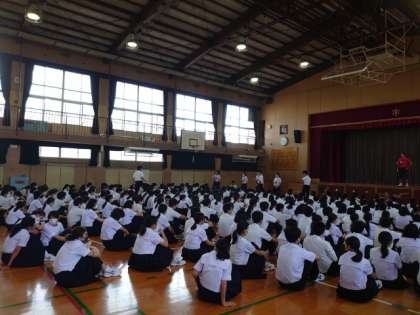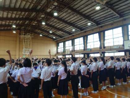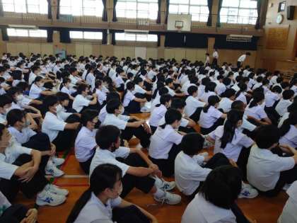 梅雨の中休みを思わせる青空が広がる朝。月曜日は全校集会を行います。今日も時間前に皆さん集合できていました。時間に対する意識が身に付いており、感心ですね。今週は期末テストがあります。悔いの残らないよう対策を講じましょう。