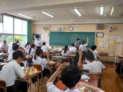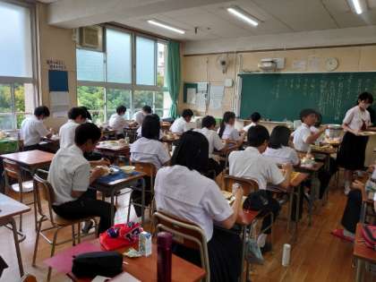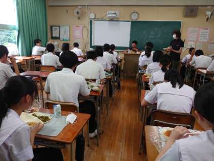 3年生の教室では皆さんが昼食中。栄養豊かなオクラですが、ネバネバ食感に好みが分かれそう。ところがトレイに大盛りの人もちらほら見かけます。お代わりの手も挙がり、けっこう食べているようで感心ですね