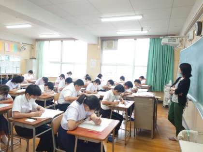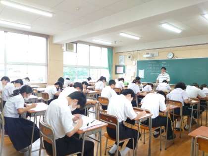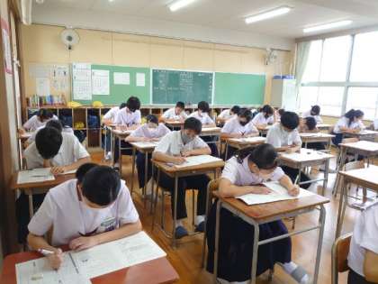 テスト1時間目は社会科です。2年生の皆さんが問題を解き進めています。1学期は地理を中心に学習しました。日本の気候や人口ピラミッドなど、授業で習った内容がたくさん出ていますね。