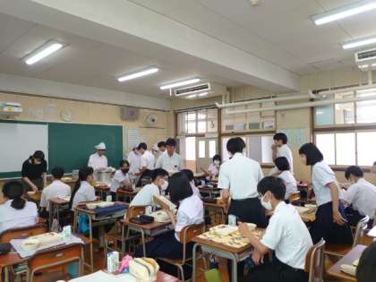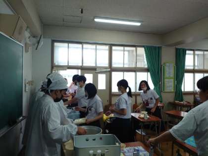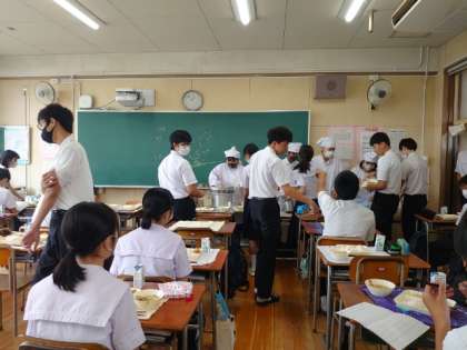 お昼休みになり、給食の準備が始まりました。3年生の皆さんが協力して配食中。今日のメニューは「中華煮・厚揚げの醤油がけ・モヤシの中華和え」。中華煮はとろみ餡がからんで熱々で美味しそう。余裕があればお代わりしてくださいね。