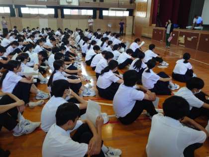 2年生の皆さんが体育館で集会を開いています。今朝はタブレット端末の使い方について、先生から説明がありました。授業で活用することも多いので、しっかりと聞いてくださいね。