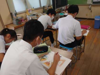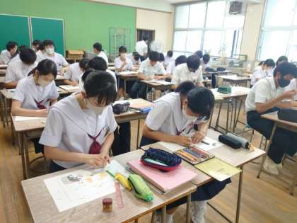 3年生美術科で制作している「一点透視図法を使った部屋のデザイン画」。下書きが概ね終了し、色えんぴつで彩色する工程に入りました。色を塗ると部屋が華やかに感じられて印象が変わります。皆さんが描いたステキなお部屋。いつか実現すると良いですね。