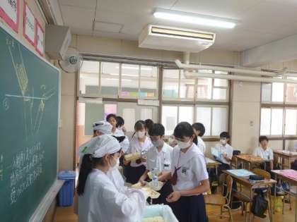 お昼のチャイムが鳴り、給食準備が始まりました。1年生の教室では協力して配食中。今日は「鮭・冬瓜(とうがん)の煮物・焼き海苔」の和食メニュー。冬瓜は今が旬の夏野菜。ビタミンCが含まれお肌の健康に良いそうですよ。