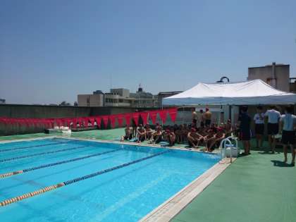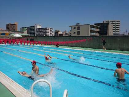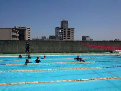 3年生の皆さんが校舎屋上のプールで水泳の授業を受けています。まずは身体を水に慣らすところから。クラスメイトの介助で水面をゆったりと背泳で進みます。皆さん気持ち良く泳いでいますね。
