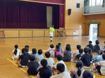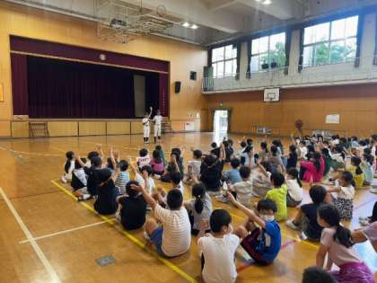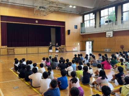 小学4〜6年生が中学校の部活動を体験する「高津スポーツクラブ ベアーズ」。今朝は味原小学校で説明会を開きました。小学生の皆さんが中学生のお話を興味深く聞いています。思わず説明に熱が入ります。