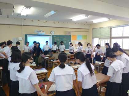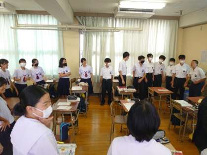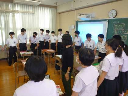 2年生理科の授業で「反応の速さ」を実験します。クラス全員で手をつなぎ、次々に手を握ってリレーする実験。最後の人までリレーするのに何秒かかったか計測します。手が受けた刺激が神経を通って脊髄・脳へと伝わる仕組みを実際に確かめました。皆さんとても楽しそうです。