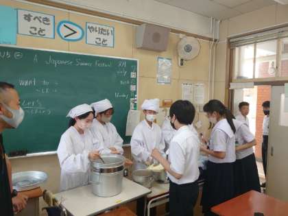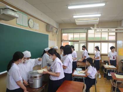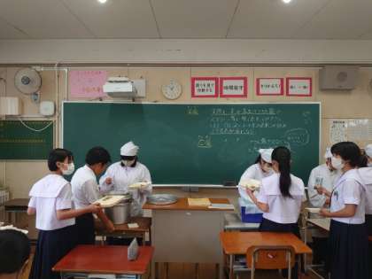昼休みになり、1年生の教室で給食準備が始まりました。今日のメニューは「牛丼・もやしとピーマンの炒め物・大福豆の煮物」。6時間目まで授業があるのも明日まで。給食をしっかりいただいて午後の授業も頑張りましょう。