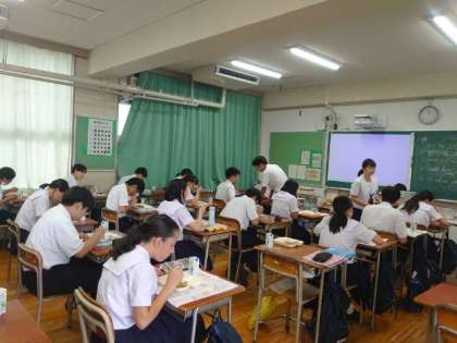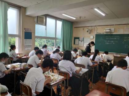 3年生の皆さんが給食をいただいています。牛丼は人気があるようです。大盛りご飯に牛丼の具をたっぷりかけて、汁だくにする人も。今日は残食が少なくなりそう。お腹と相談して、いっぱい食べてくださいね。