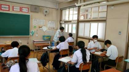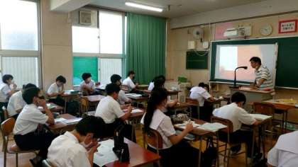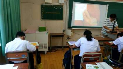 1年生技術科で製図の実習に取り組みます。スクリーンには書画カメラ(実物投影機)を使って、方眼紙が映されています。先生が手順を説明しながら、実際の作図の様子を映します。スクリーンの映像を見て、上手く作図できましたか?