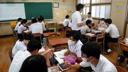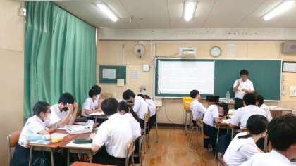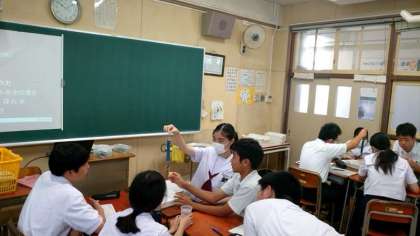 3年生理科の授業で浮力に関する実験を行います。バネばかりに重りを吊るし、水が入ったビーカーに入れてみます。重りを水中に入れると、バネばかりの数値に変化が起こります。この変化が浮力によるもの。皆さん上手くデータが取れましたか?