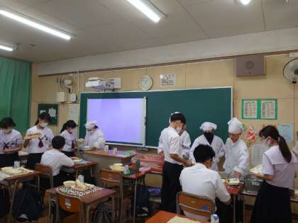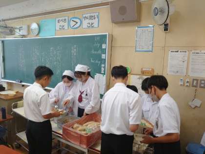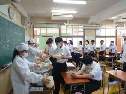 お昼のチャイムが鳴り、給食準備が始まりました。1年生の教室では食事の配食中。今日の献立は「鶏の唐揚げ・冬瓜の中華スープ・ツナとチンゲン菜の炒め物」。サクサクに揚がった唐揚げは、おかわりする人も多そうです。たくさんいただいてくださいね。