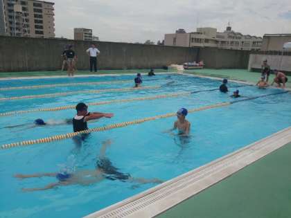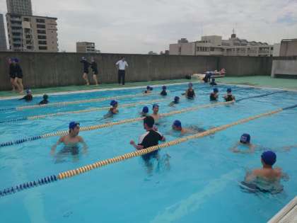 2年生水泳の授業では、ペアになって泳ぎ方を確かめます。今日チェックするのは平泳ぎの足の使い方。両足が足の甲で水を蹴る「あおり足」になっているでしょうか?なかなか難しいですが、互いにアドバイスしてくださいね。