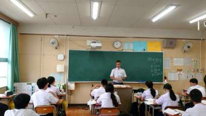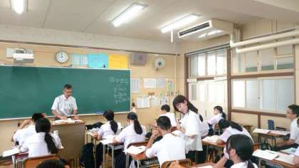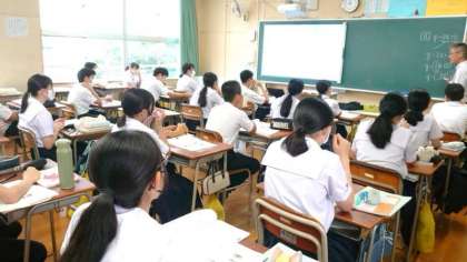 2年生数学科で「一次関数」を学習中。一次関数の式は「y=ax+b」で表します。授業では黒板に書かれた文字式が一次関数かどうかをみんなで考えます。「y=ax+b」の形になるかに着目しましょう。