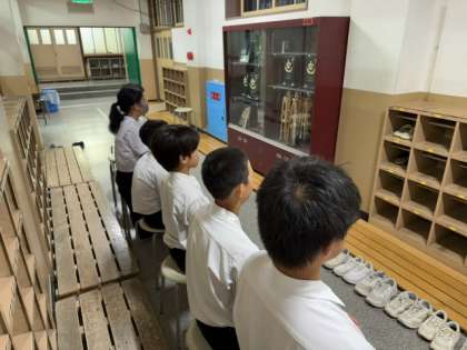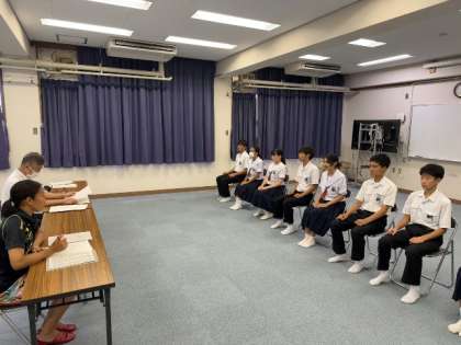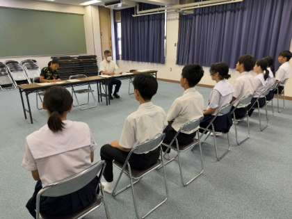 2年生の皆さんが2階廊下で校長面接のスタンバイ中。事前に面接の受け方を教わっているようで、待っている時の姿勢もバッチリです。面接でのやりとりも、結論・理由がしっかりと答えられており感心します。