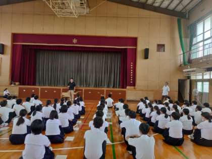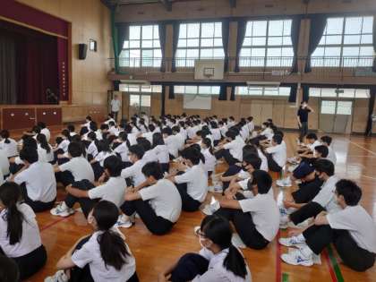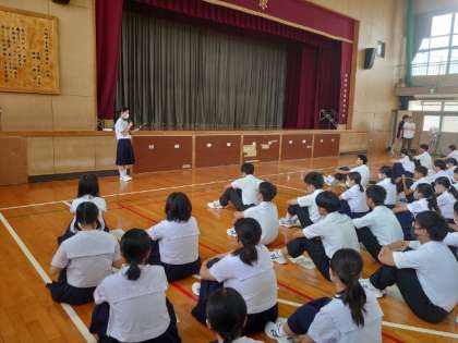3年生の皆さんが学年集会を開いています。火曜日に実施するオンライン学習について説明中。お家に帰ってからタブレット端末等を使ってデジタルドリルに取り組みます。上手く接続できるか確かめてくださいね。