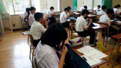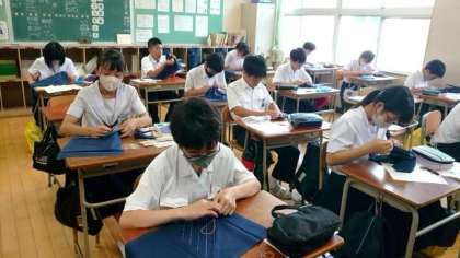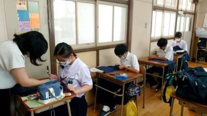 1年生家庭科の授業で取り組んでいる刺し子刺繍。皆さん色とりどりの刺繍糸を使って、好きな模様を刺し進めています。最初に考えた計画通りに作業が進んでいますか?