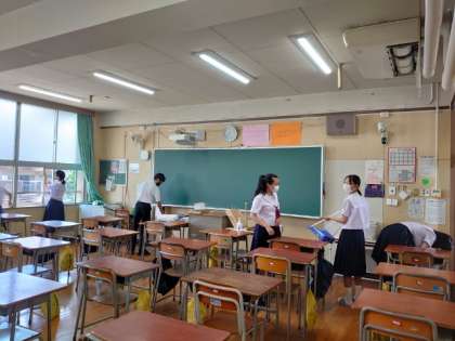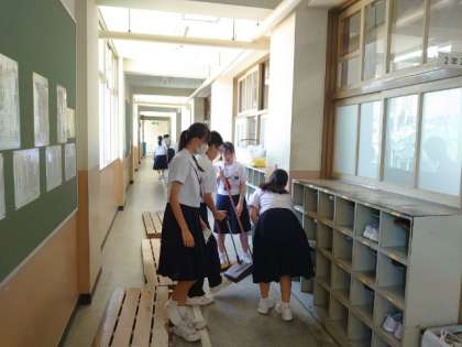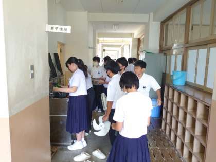 2年生の皆さんが手洗い場に集まってきました。教室のエアコンフィルターと換気扇の羽根を水洗いするとのこと。2学期も快適に過ごせるよう、しっかりと洗ってくださいね。