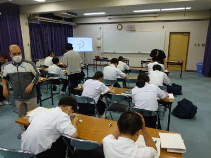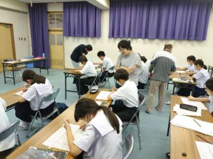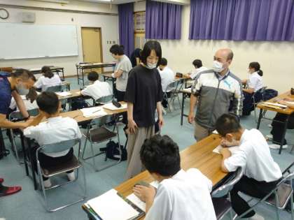 1年生夏休みの補充授業2時間目。英語の学習が始まりました。今日は疑問詞を復習します。「when(いつ) where(どこで) who(誰が) what(何を) why(なぜ) how(どのように)」の6つの疑問詞の使い方をおさらいしましょう。