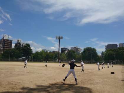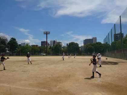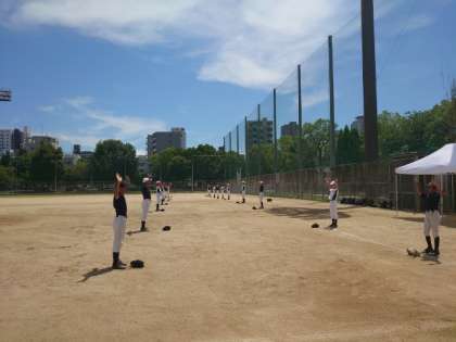 まずはキャッチボールで身体を慣らします。今日は外野と内野の連係プレーや球場の大きさ (サイズ) を意識したプレーに取り組むそうです。学校ではなかなか練習できないメニューが盛りだくさんです。