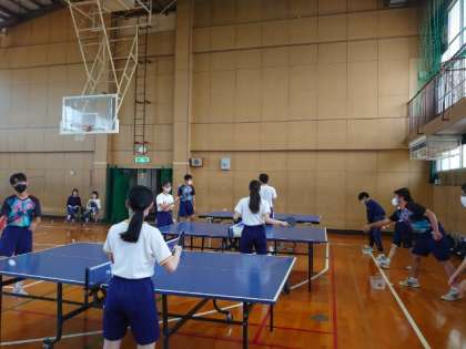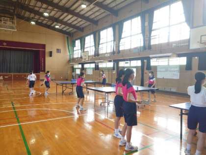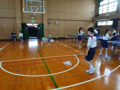 体育館では卓球部の皆さんが来る個人戦にむけて練習中。ペアになってラケットを振る人の間を、虫取り網を持つ人の姿が行き来します。こぼれた球を拾うのにとても便利だそうです。網を使う知恵はなかなか思い付かないですね。