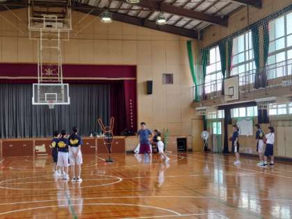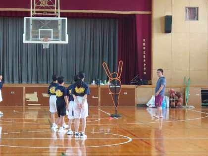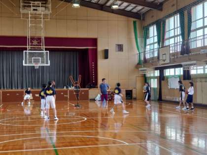 体育館では女子バスケットボール部の皆さんが攻撃の動きを教わっています。コートにはディフェンスマネキンがセットされ、ディフェンスダーがいる状況の動きを体得します。先輩が引退し、新チームでの練習を頑張ってくださいね。