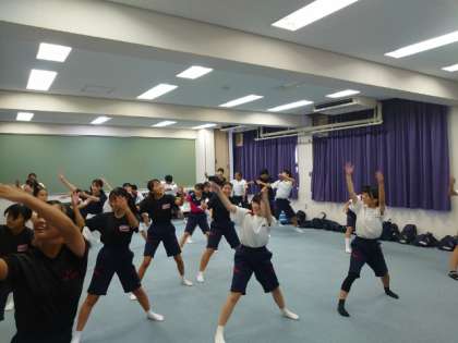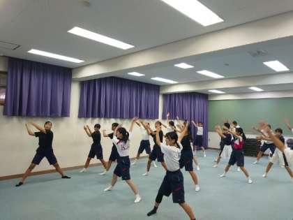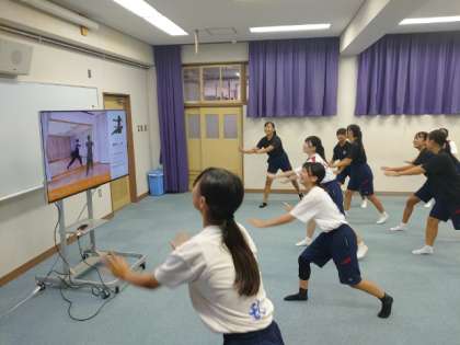 前方のテレビに動画が流れる中、音楽に合わせて皆さんが懸命に踊ります。躍動感溢れるダイナミックな踊りが「南中ソーラン」の醍醐味。全身をフルに使って表現しましょう。