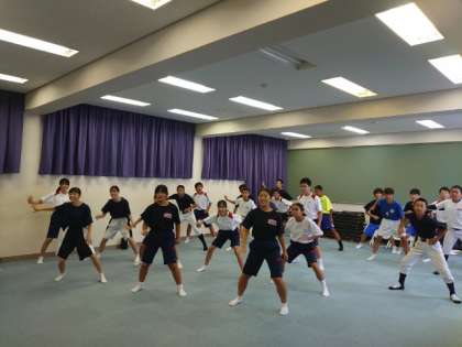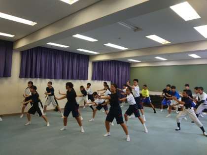 体育大会の2年学年演技「南中ソーラン」。各クラスのリーダーが集まり、振り付けの練習に取り組んでいます。夏休み中に振り付けをマスターし、2学期にはクラスメイトに伝達する予定。皆さん懸命に頑張っています。