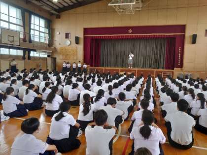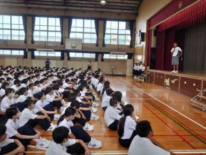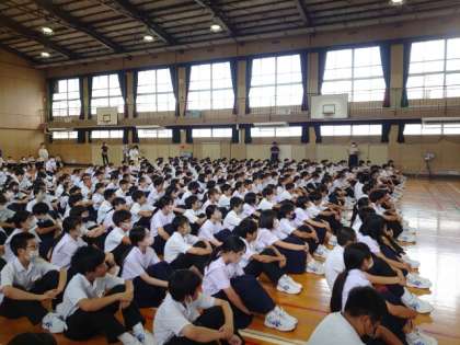 夏休みも残り1週間。2学期のスタートを間近に控える中、全校登校日を行いました。今朝は体育館に集まって先生のお話を聞いています。皆さん、夏休み中に事故やトラブルに遭いませんでしたか?