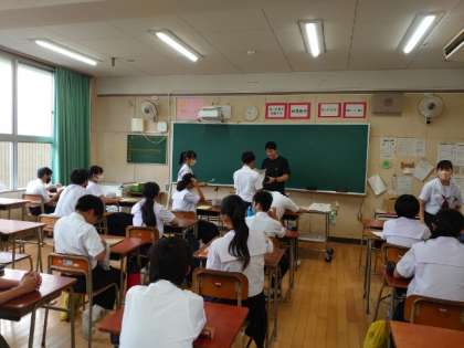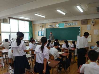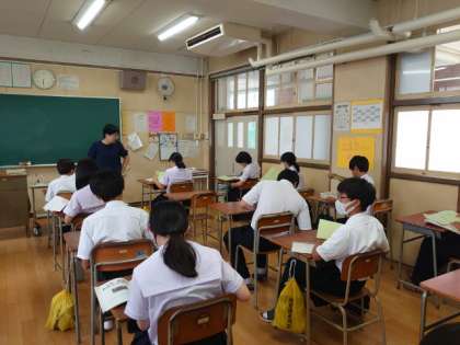 集会後、各クラスに戻って学級活動が始まりました。1年生の教室では、先生が夏休みの宿題を集めています。皆さんカバンから教科の宿題を取り出して、提出に備えます。うっかり忘れた宿題はありませんか?