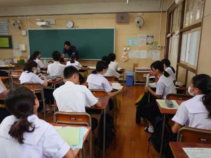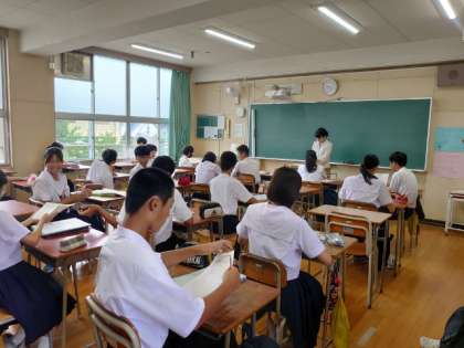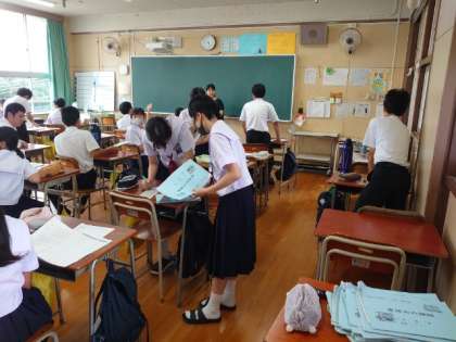 2年生の教室でも宿題を集めています。夏休みの宿題は、本日(全校登校日)・2学期始業式・2学期最初の授業のいずれかで提出するようになっています。皆さん期日を守って、漏れの無いように気をつけましょう。