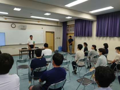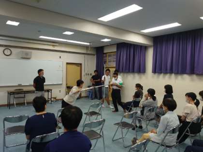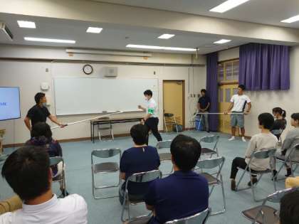 登校日の後、教職員研修会を開きました。天王寺警察署から講師をお招きし、学校に不審者が侵入した際の対応について教わります。刺股(さすまた)の使い方も実践させていただきました。天王寺警察署の皆様、ご指導いただき、ありがとうございました。