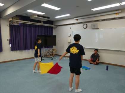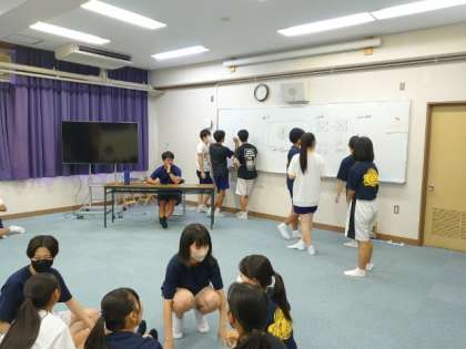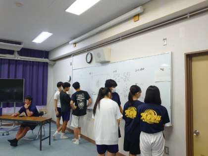 体育大会で披露する3年生学年演技。クラスのリーダーが集まり何やら相談中。ホワイトボードに記された構成図を見ながら意見を交わしたり、フラッグパフォーマンスを確かめたり、各パートで知恵を出し合います。仲間で力を合わせた取り組みは夏休みの素敵な思い出になることでしょう。