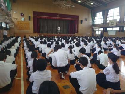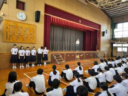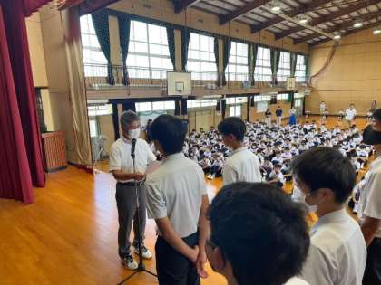 月曜の朝は全校集会を開きます。今朝も皆さん意識して早めに集合していましたね。先週の始業式に続いて、部活動で活躍した皆さんの賞状を披露しました。夏休みの努力が実って本当に良かったです。