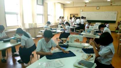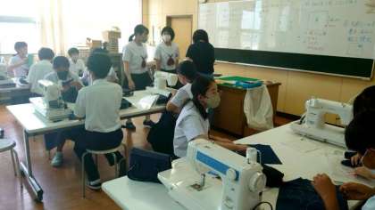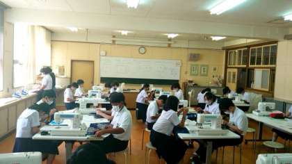 1年生家庭科の授業で制作している「刺し子刺繍」。刺繍の工程がほぼ出来上がり、布地の周囲をミシンがけする段階になりました。ミシンの扱い方に加え、まっすぐに縫えたかがポイントだそうです。皆さん慎重に取り組みましょう。