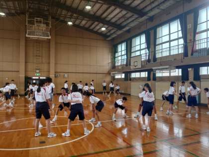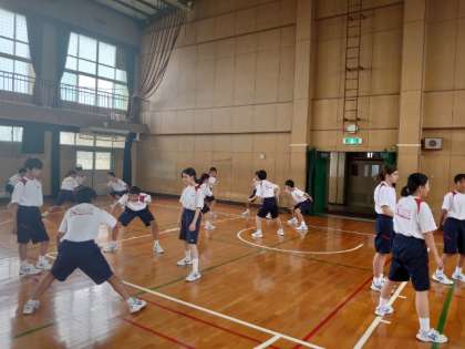 2年生体育の授業で、体育大会の学年演技「南中ソーラン」の練習が始まりました。各グループにダンスリーダーが入り、クラスメイトに振り付けを教えます。少人数で練習すると覚える速さが違いますね。夏休みにリーダーさんが一所懸命練習した甲斐がありましたね。