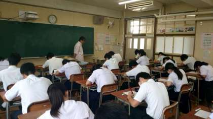 3年生数学の授業で2次方程式のテストが行われています。夏休み明け最初のテスト。皆さん、1学期に教わった解法を思い出しながら問題を解いています。お家での学習の成果が出るでしょうか?