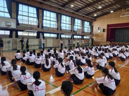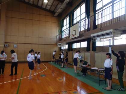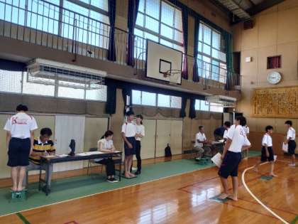 体操服に着替えた2年生が体育館に集まっています。これから身長・体重を測定するとのこと。4月にも測りましたが、どのくらい成長したでしょうね。