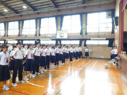 月曜の朝は全校集会。今日も早めに集まって、集会に備えます。今朝は保健委員さんから「使い捨てコンタクトレンズケース」のリサイクル活動の報告がありました。先日、校内で集めたケースを事業所に届けてくれました。ケースを焼却せずに再製品化することで、二酸化炭素削減に貢献しています。これからも活動を続けてくださいね。
