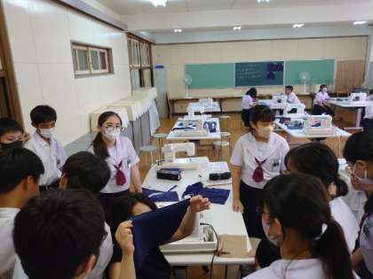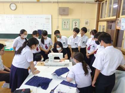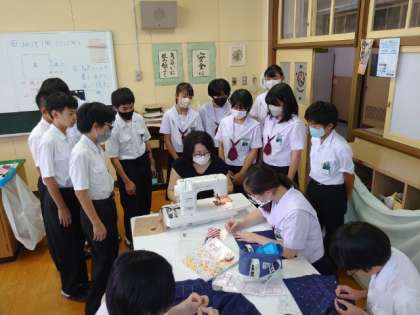 1年生家庭科で制作している刺し子刺繍。今日はミシンを使って「角縫い」にチャレンジ。まずは先生がお手本を実演します。皆さん、先生の周りを取り囲みミシンの操作に注目しています。手順を目に焼き付けて、上手く出来ると良いですね。