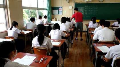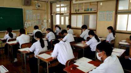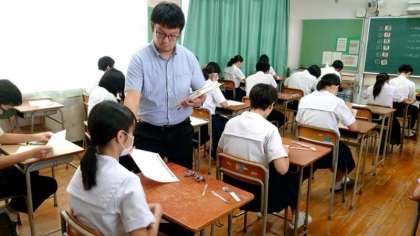 2時間目は社会科のテストです。監督の先生から問題冊子が配られています。試験時間は45分。校内のテストより5分短いので、時間配分に要注意。解答を見直す時間も考えて、効率良く解き進めましょう。