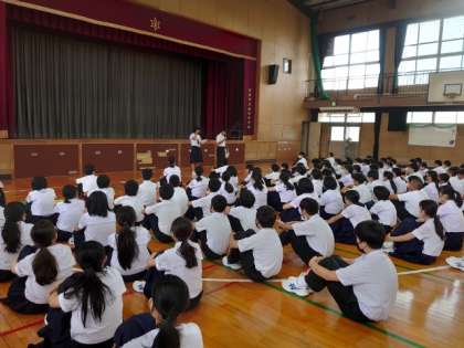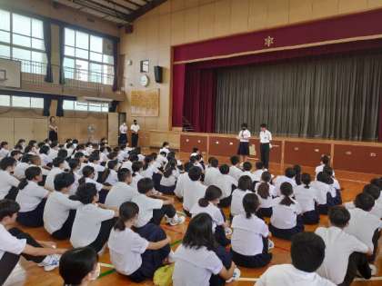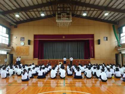 水曜の朝は1年生が学年集会を開きます。今朝も皆さん体育館に集まってきました。昨日行われた生徒会各委員会の活動報告を聞いているようです。各委員さんがしっかりとメッセージを伝えていて、頼もしいですね。