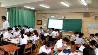 2年生英語の授業で映画「美女と野獣」の音楽が流れています。夏休みの宿題で映画の音楽(数曲)の歌詞についての調べ学習がありました。グループで好きな曲を選び、英語の表現など歌詞の特徴をまとめるそうです。皆さんはどの曲を選びますか?