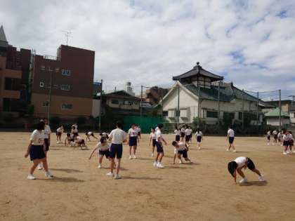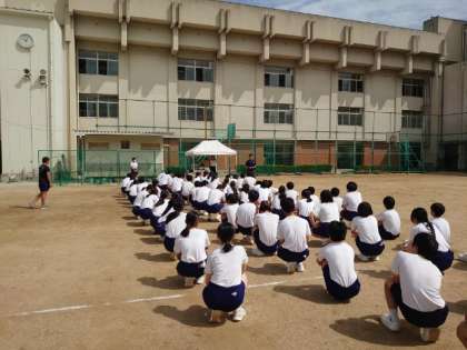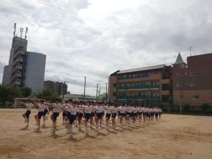 運動場で3年生の皆さんが体育大会の練習中。行進や学年演技など、周囲との感覚や行進時の位置、実際の距離感などを確かめているようです。3年生にとって最後の体育大会。みんなで心を合わせて取り組みましょう。